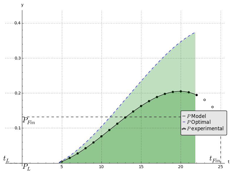 The dashed line in the Figure 3 mean forecast for the product synthesis, if negative processes of deterioration of the product due to the lack of any nutrient components contained in this product for cells growth were prevented, but at the same time this component is as a main limiting factor in the nutrient medium.